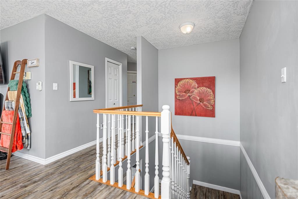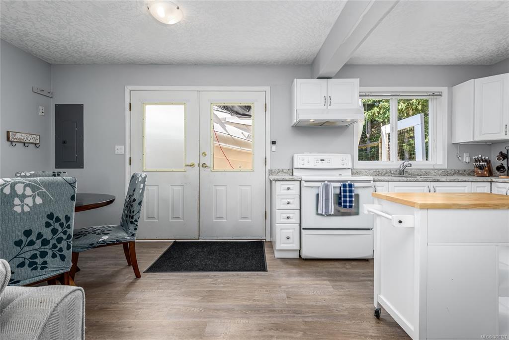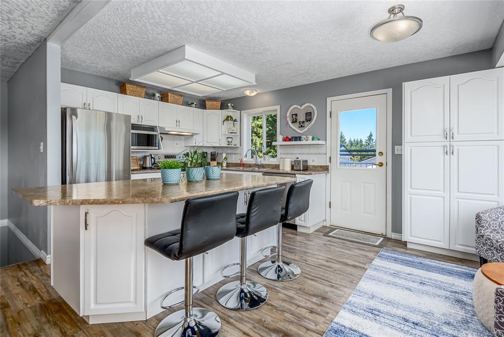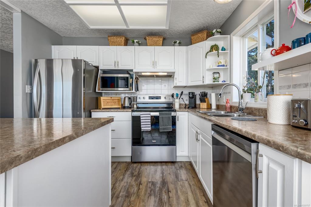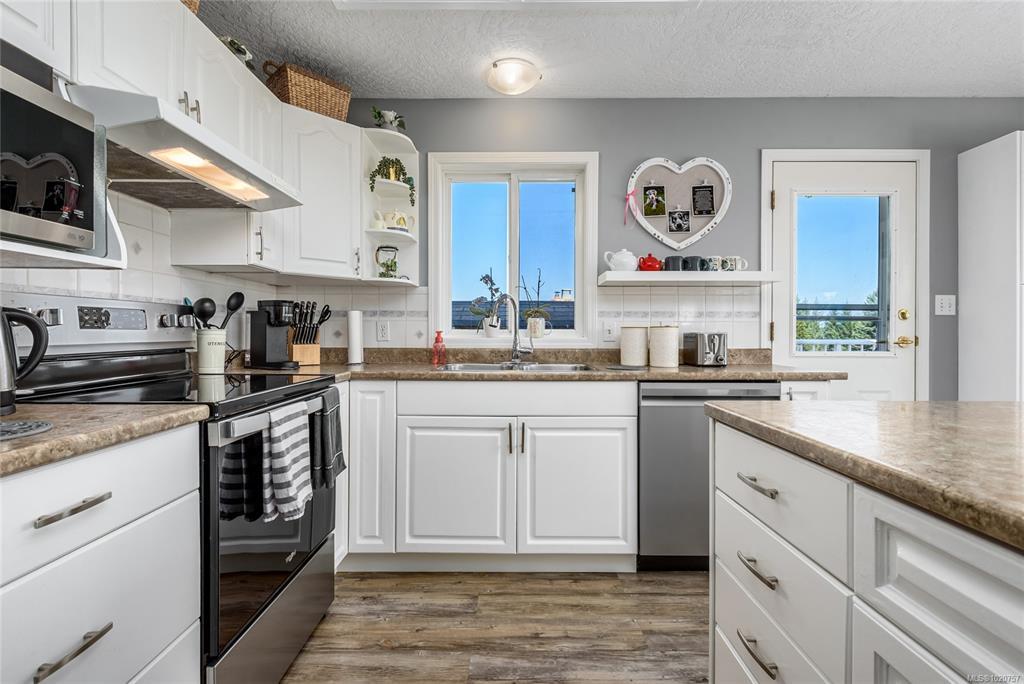 Situated on 0.44-acre corner lot north of Comox, 4-bedroom, 3-bath home offers easy access to Seal Bay Park’s trail system & nearby beaches, a 5-minute walk away. The property faces an open field & treed area, providing steady natural views from the living room, front windows, & deck. Upper floor includes the main living & dining areas, along with a gas fireplace in the living room. The kitchen has updated cabinets, new appliances, & practical layout, the roof was replaced in 2025 with fiberglass shingles. The lower level features non-conforming suite with its own entrance, driveway, den a second gas fireplace, & private laundry for independent use. Outdoor features include a fenced backyard, gazebo, fire pit area, workshop space under the deck, raised garden beds, and RV and boat parking. Zoned R-1, the property allows a secondary dwelling up to 90 m² and is about 10 minutes from Comox with nearby amenities. $5,000 decorating bonus to the Buyer to personalize the home to their taste.