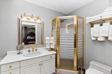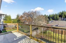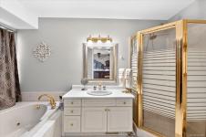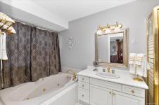 The primary suite features a walk-in closet, an ensuite with a walk-in shower & jetted tub, & French doors opening onto a second deck.