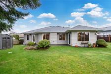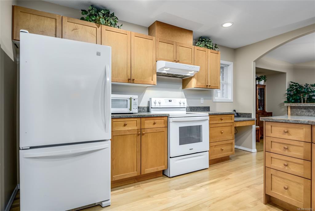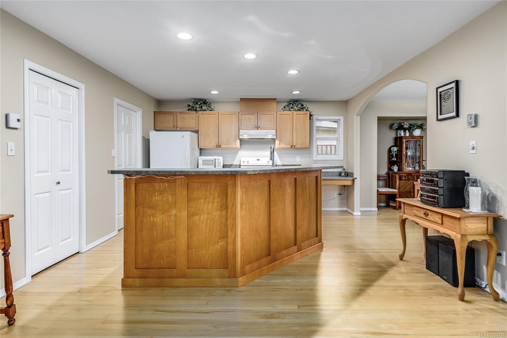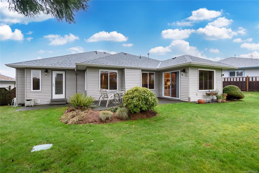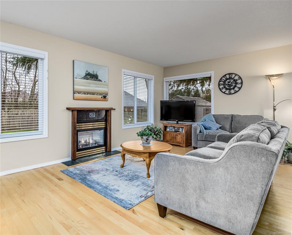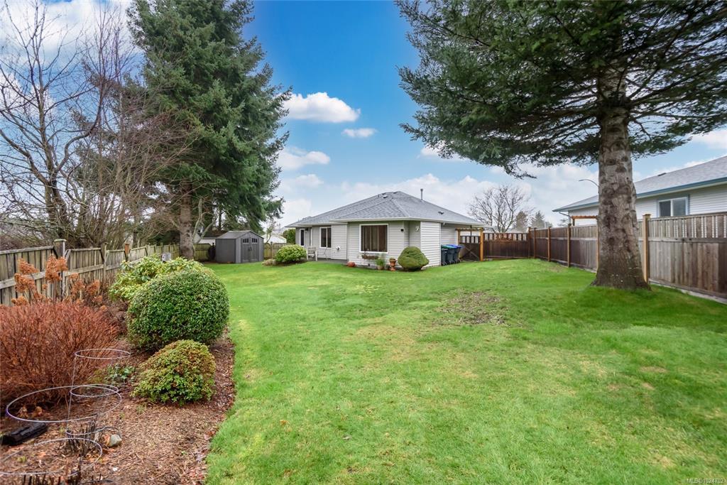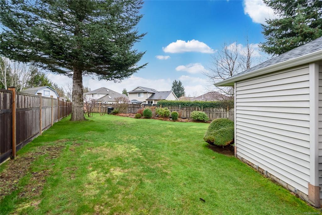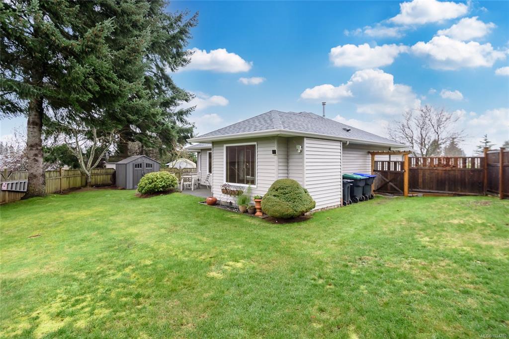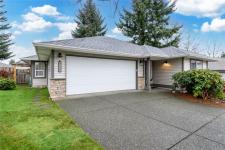 Wonderful 3 bdrm/2 bath rancher located on a quiet cul-de-sac in Courtenay East, this is a home you will love! Excellent layout with open plan offering 1411 sf of living space. Well-designed kitchen with wood cabinets, centre island (eat-up bar) & large walk-in pantry. The adjoining living room offers a gas fireplace & spacious dining room with convenient patio/backyard access. This home is extra bright with lots of windows, what a treat! Spacious primary bdrm with double closets, full 3-pce ensuite & door to patio area. You’ll appreciate the hardwood floors, new hot water tank 2023, new roof 2025, gutter guards & double garage. The level lot of 0.18 acres is landscaped & fenced, there’s an inground sprinkler system, garden shed & fruit trees! The home backs onto the Idiens Greenway so get your walking shoes ready! The location is central, close to shopping & amenities in either Courtenay East or Comox. All in all, it’s a perfect place to call home!