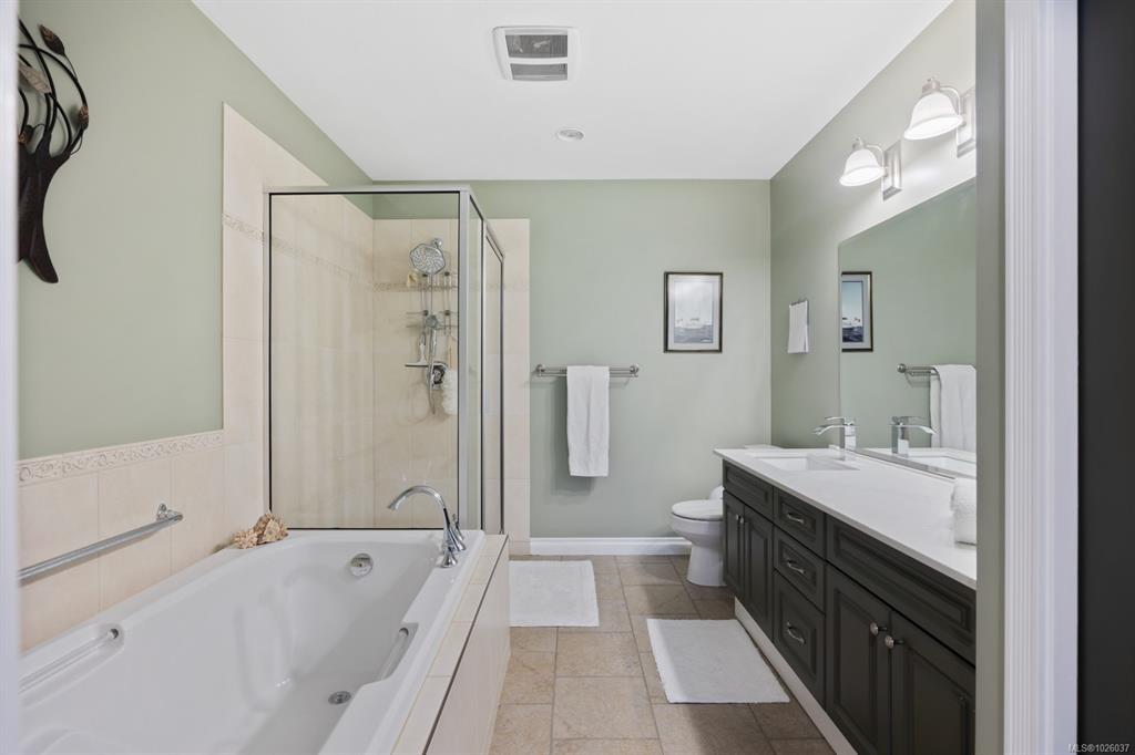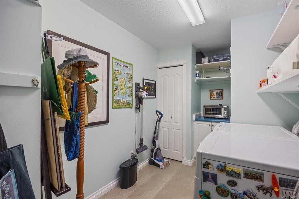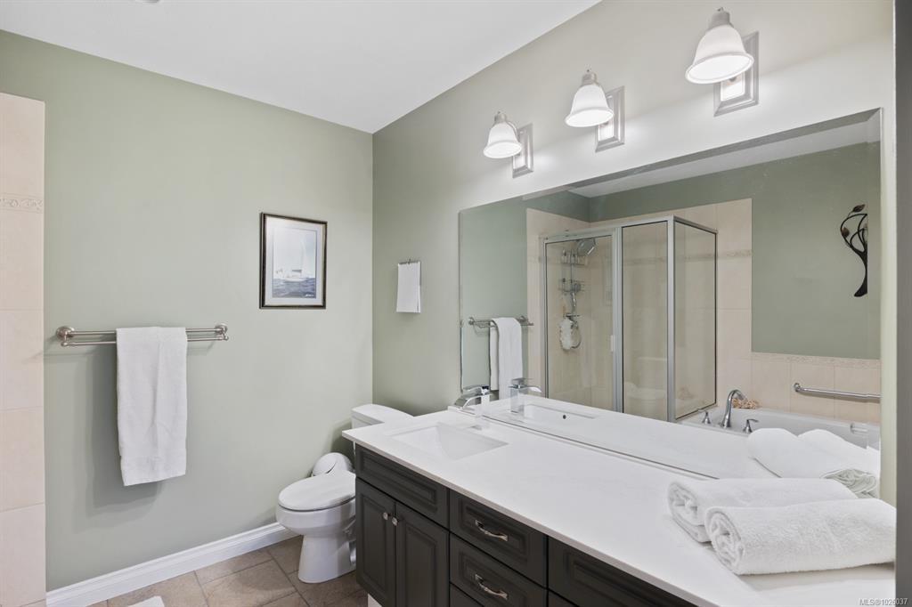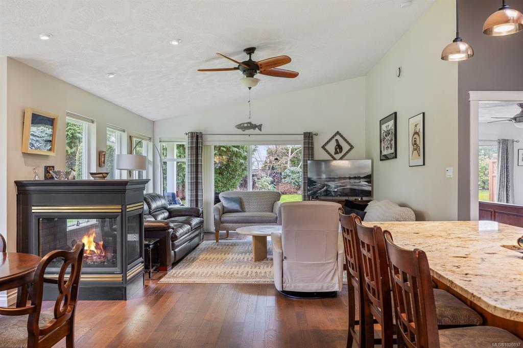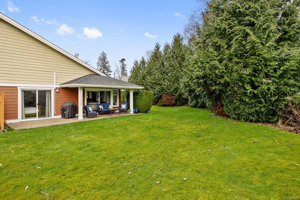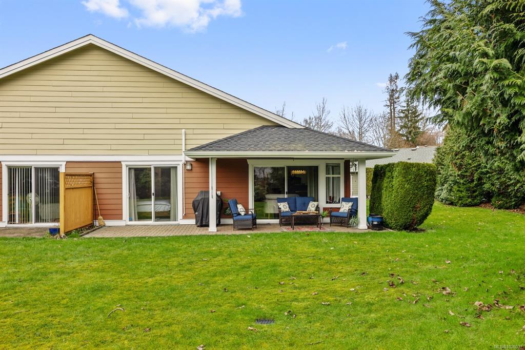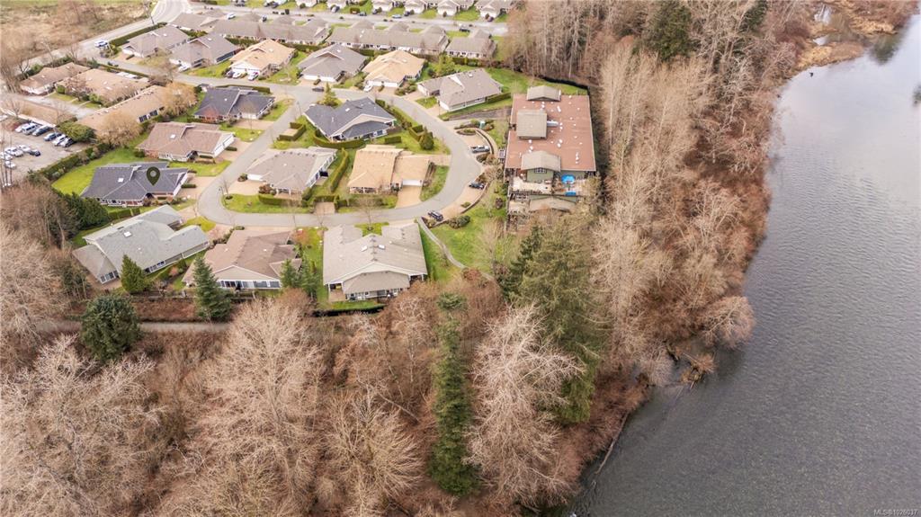 Welcome to River Glen. This rare, meticulously maintained & updated 3 bed, 2 bath patio home along the peaceful Puntledge River, is a short walk to downtown Courtenay & located in the well-run, proactive, strata. No detail overlooked, this upscale patio home features 6 custom additional south facing windows, heated hardwood & tile floors, new HRV system, new heat pump, new roof, new hot water tank, high-end appliances, & fresh paint throughout. Open concept kitchen with granite counters. Vaulted ceilings for a bright, open feel, while a 3 sided gas fireplace anchors the living space. The well designed floor plan provides separation & privacy for all bedrooms. Updated sinks, faucets, & quartz counters in bathrooms. The primary ensuite includes a walk-in shower, soaker tub, & generous closet space. An extended sliding door opens to a spacious patio spanning the primary bedroom to the living room. Complete with gas BBQ hookup, sprawling green lawn, southern exposure & excellent privacy.