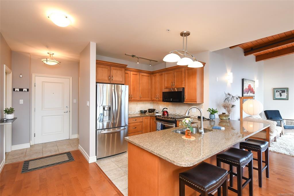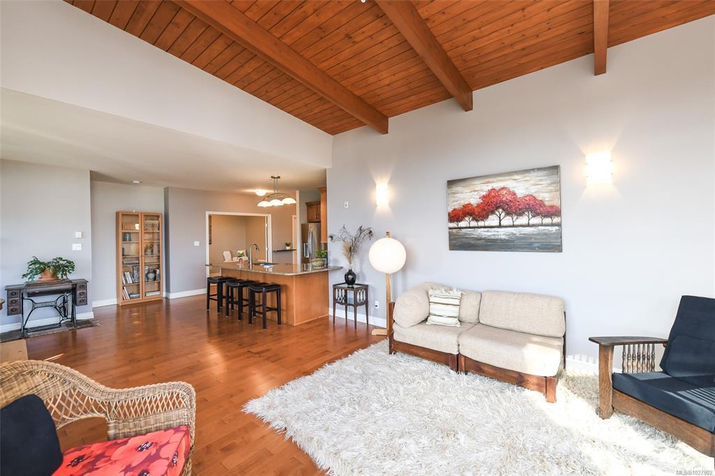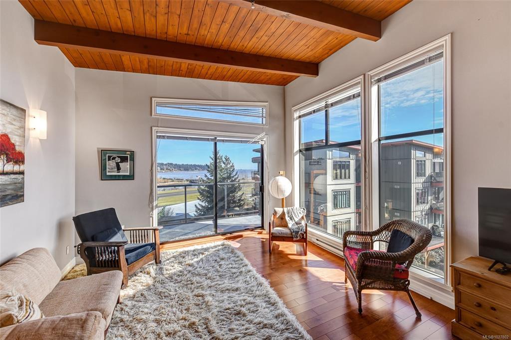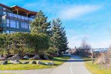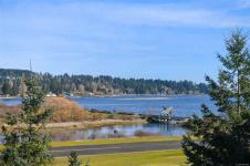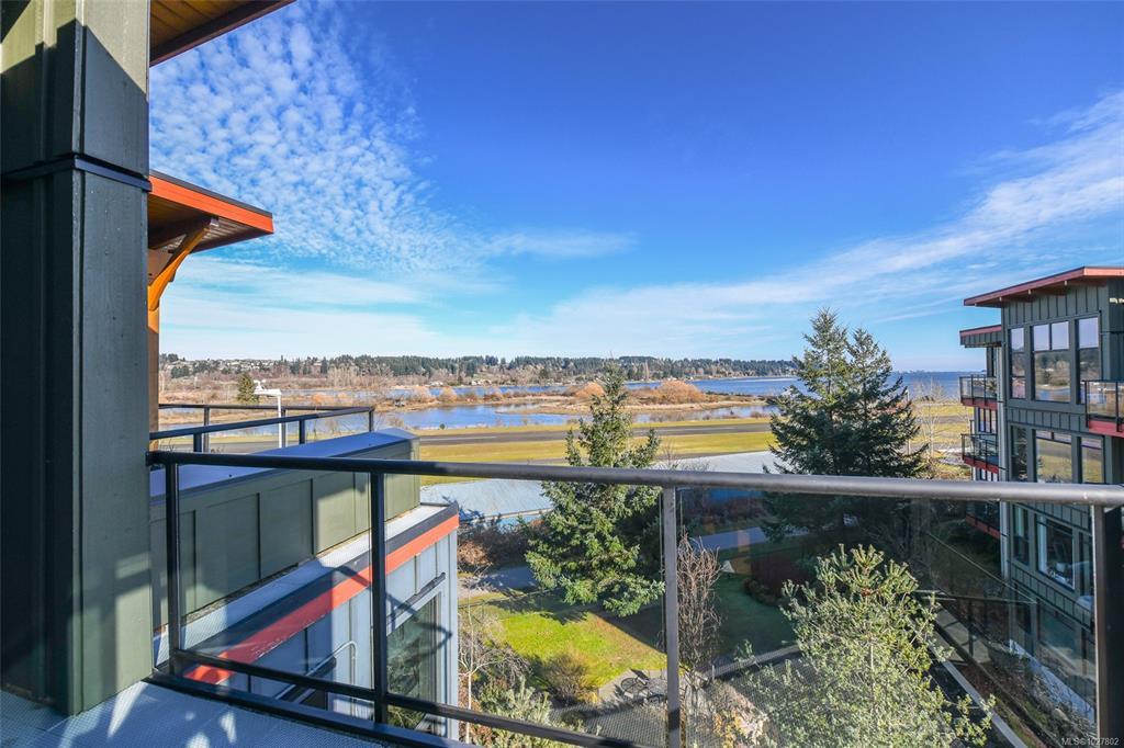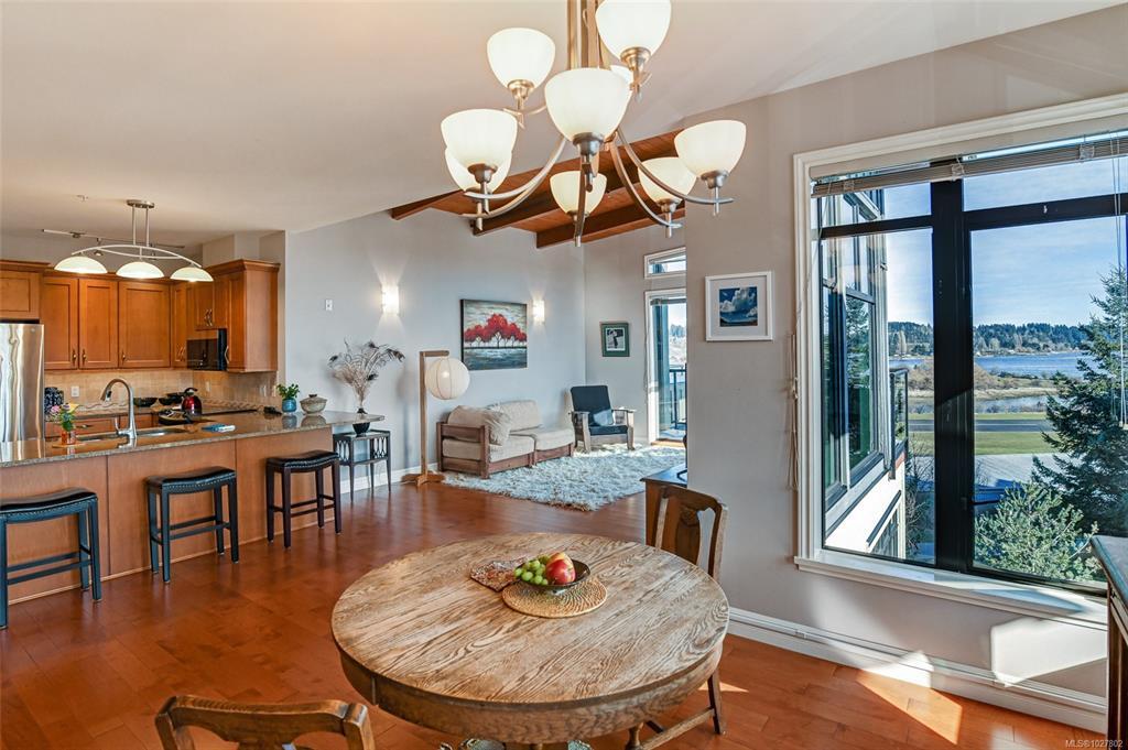 Enjoy breathtaking top-floor views overlooking the Courtenay River Estuary, the Airpark, the Riverway Heritage Walk, and the Beaufort Mountains to the southeast, all from the quiet privacy of Building #3. This stunning open-concept condo features soaring vaulted ceilings, over-height windows and doors, and abundant natural light throughout. Two private balconies offer the perfect vantage point to enjoy spectacular sunrises, moonrises, and sunny southeast exposure year-round. The thoughtfully designed layout includes a spacious primary bedroom complete with walk-in closet and ensuite, plus a versatile den with etched-glass French doors, ideal as a second bedroom or home office. Two full bathrooms provide comfort and flexibility for guests. Residents enjoy premium amenities including three guest suites, secured entry, gated underground parking with storage lockers, a car wash station, and dedicated bike and kayak storage. Centrally located in the heart of Courtenay!