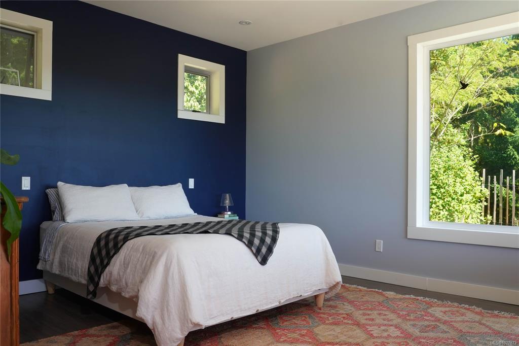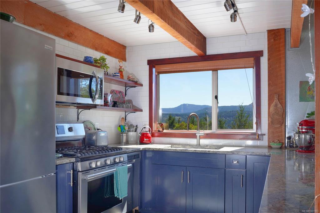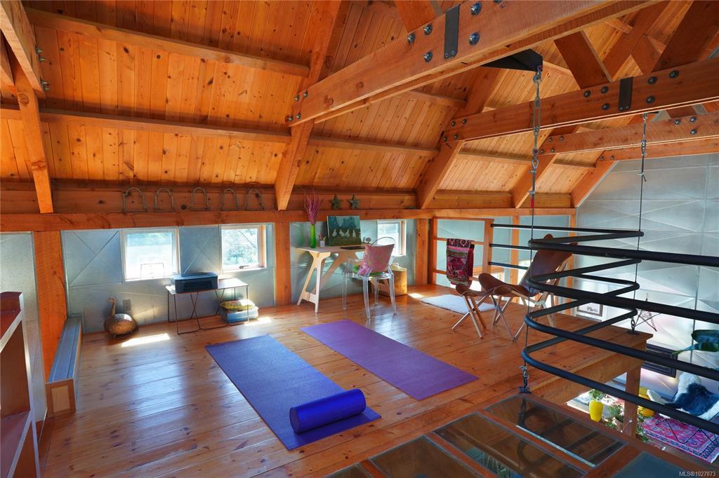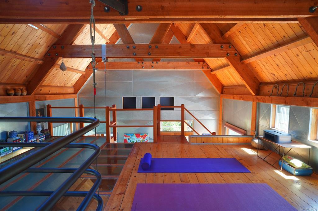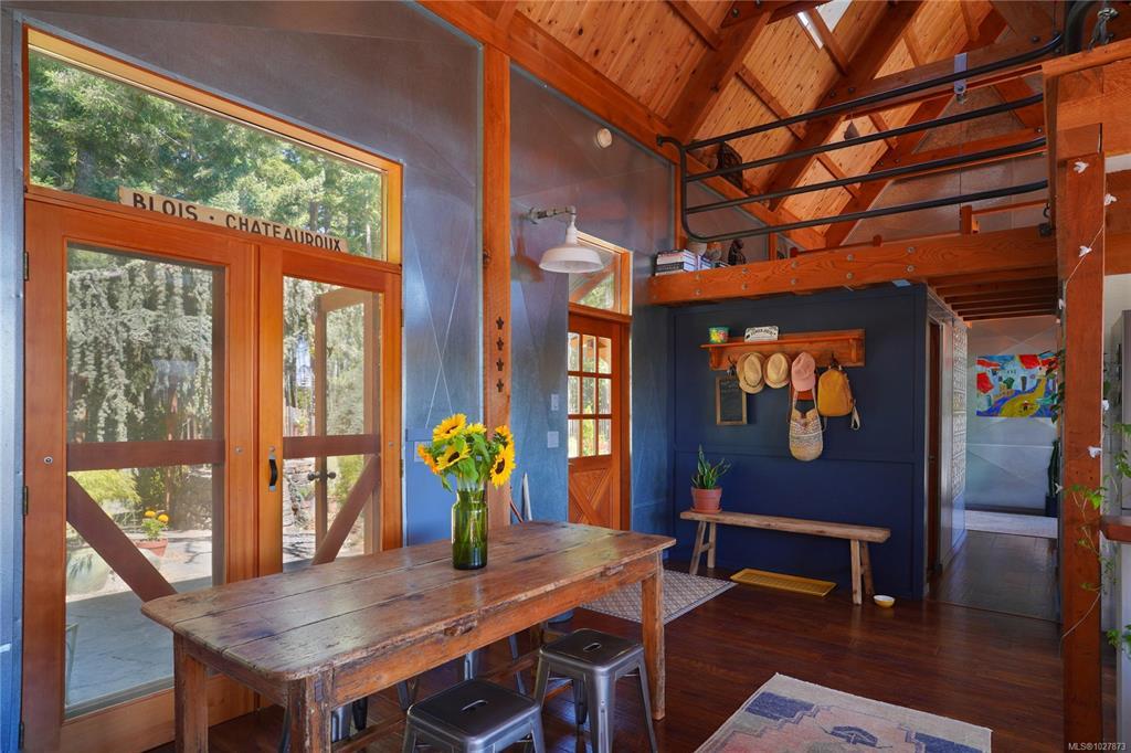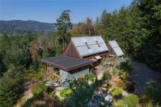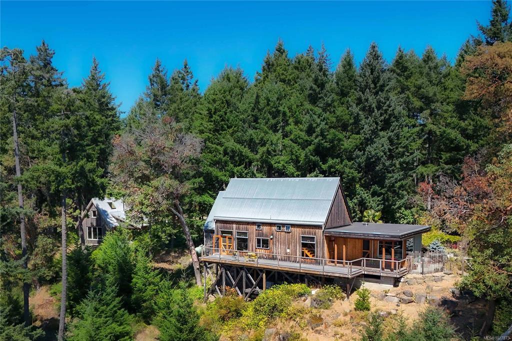 Stylish Salt Spring Sanctuary. Set back on a private 3-acre lot, this designer tree house offers views from every window. An open floor plan with a vaulted cathedral ceiling is further enhanced by unique metal walls and a propane fireplace for chilly nights. Two generous bedrooms at opposite ends of the house, each with access to outdoor space, are complemented by two modern bathrooms. South-facing, an expansive cedar deck wraps around the house, creating a seamless indoor/outdoor living experience. On the front side, a fully-fenced French-inspired courtyard with a stone patio provides a serene outdoor setting perfect for entertaining. Down its own driveway, a 1074-sq. ft. additional building offers a multi-purpose space with soaring timber ceilings, perfect for a home office, workshop, or gallery space. With a boat launch down the road, the Long Harbour ferry minutes away, and all the conveniences of Ganges close by, a turn-key Salt Spring Island property awaits on Little Mountain.