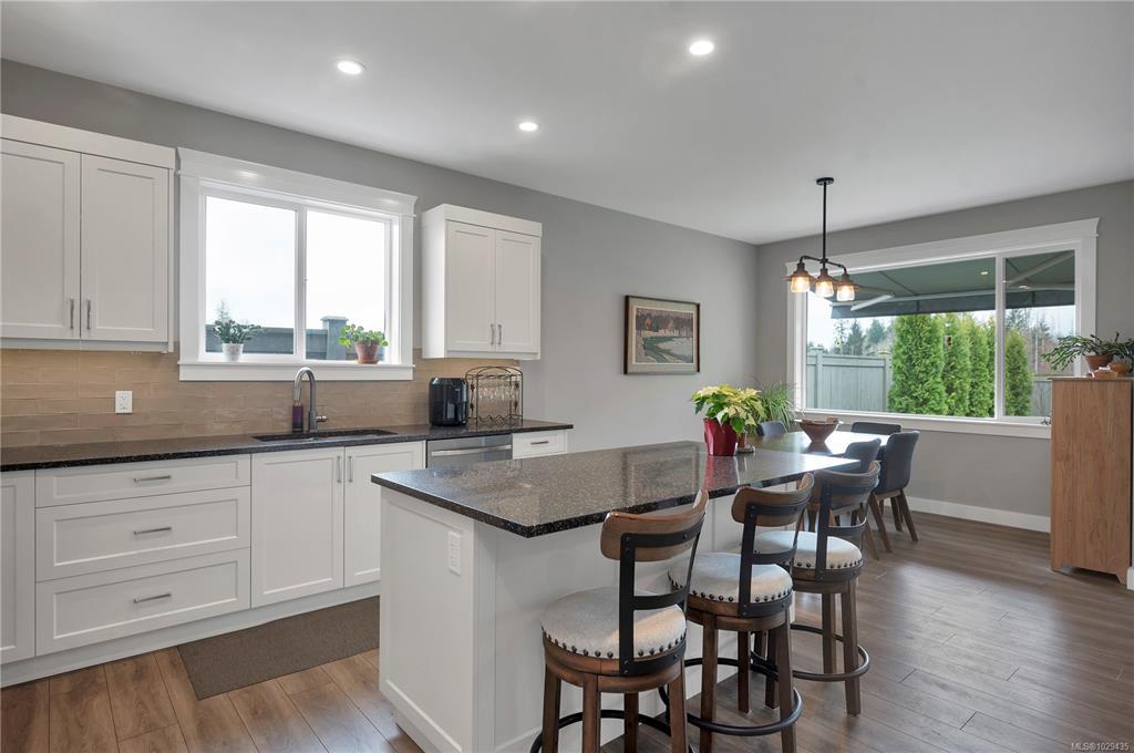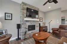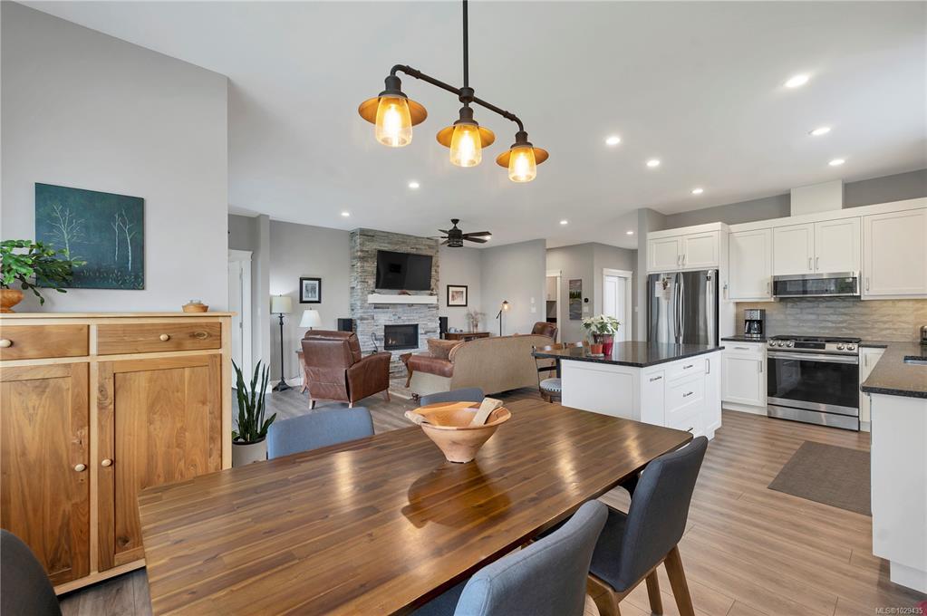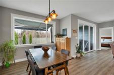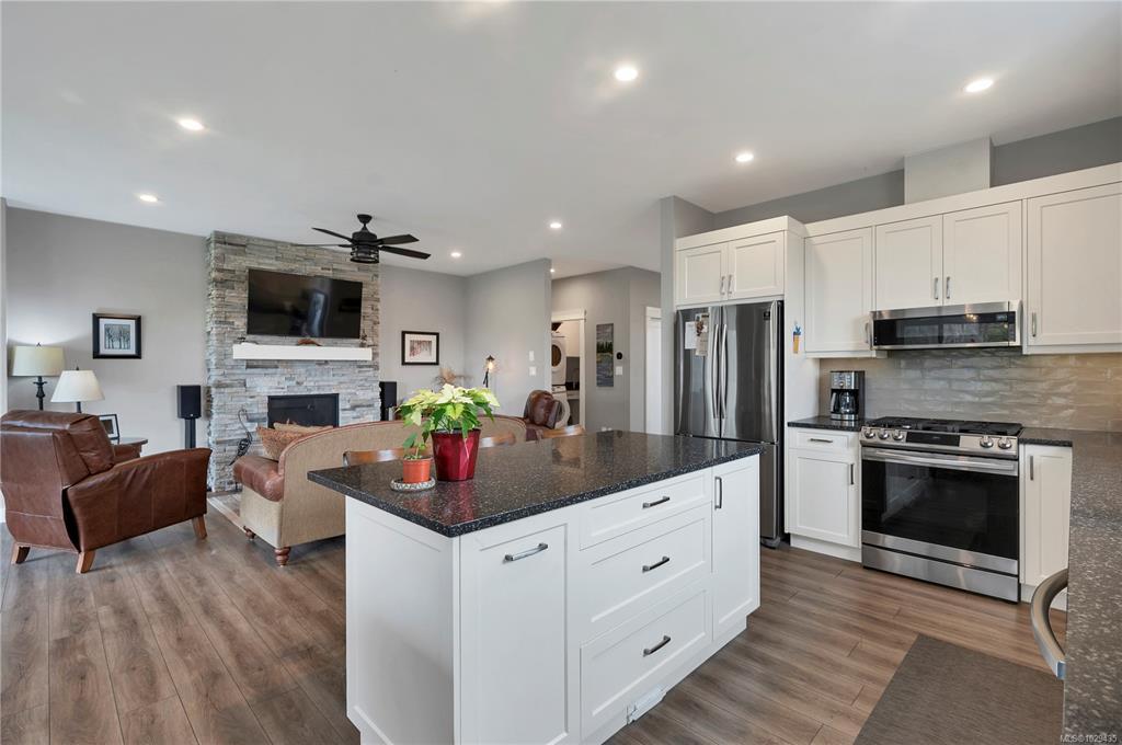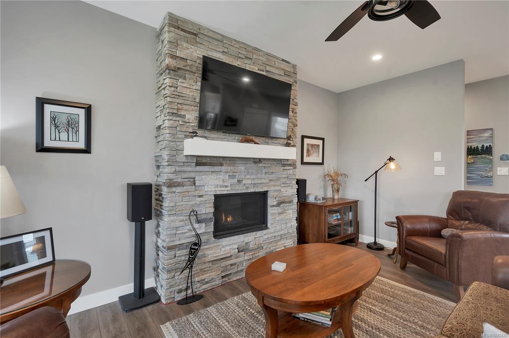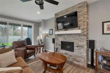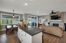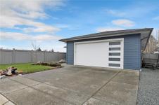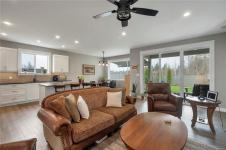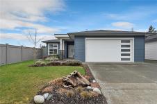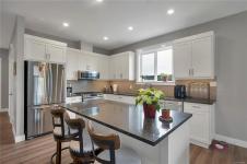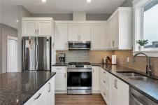 Introducing this stunning, like-new, 3-bed, 2-bath executive rancher in a quiet, well-maintained bareland strata complex. This end unit was thoughtfully customized at construction and is a masterpiece of modern living, featuring hot water on demand, an efficient heat pump, and heated floors in the master bathroom. The chef’s kitchen offers custom cabinets, under cabinet lighting, quartz countertops, a gas stove, matching quartz in both bathrooms and laundry and a tiled shower upgrade in the ensuite. The bright, open-concept layout is enhanced by 9-foot ceilings and a custom fireplace, perfect for comfortable living and entertaining. Step outside to a private, south-facing backyard backing onto undevelopable parkland, complete with a steel-reinforced aggregate patio, gas BBQ outlet, and custom awning. Additional highlights include a 3-zoned irrigation system with censors, a spacious, heated double-car garage and a central location near shopping, trails, and amenities.