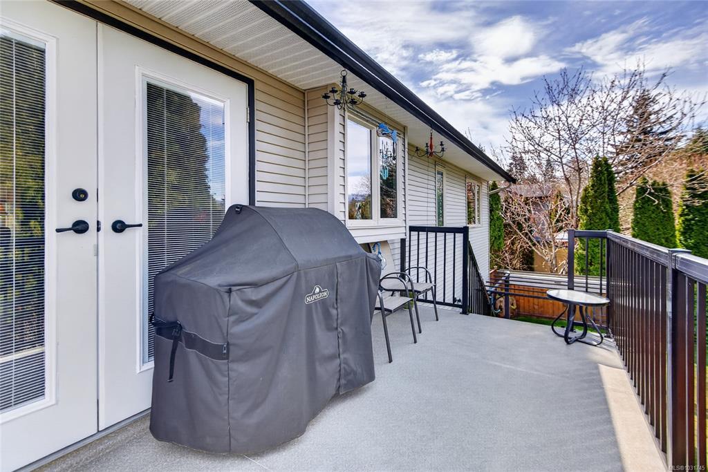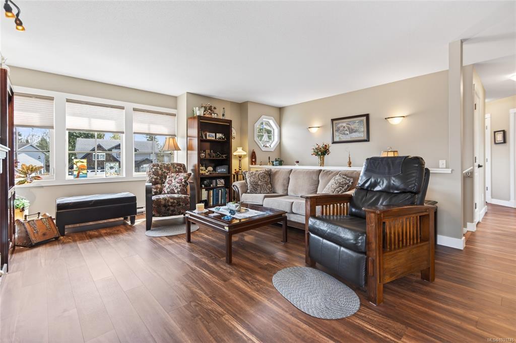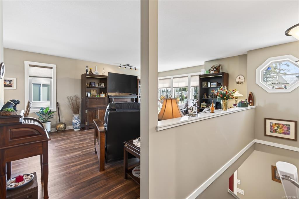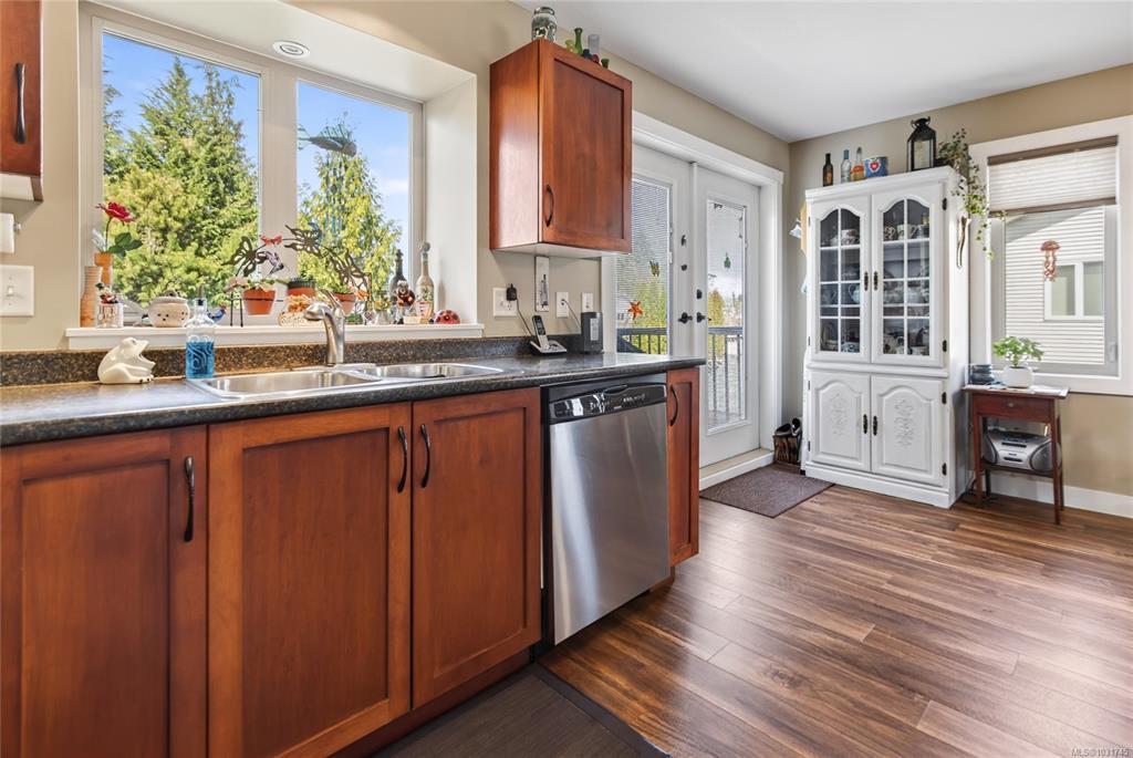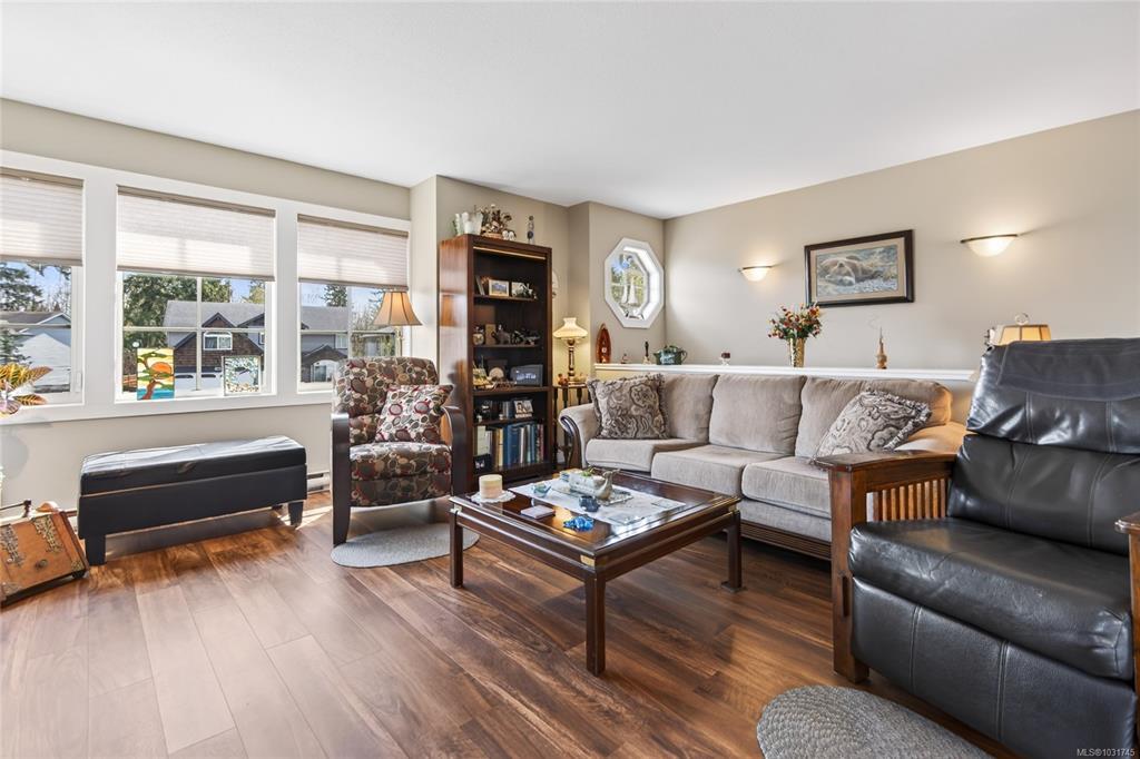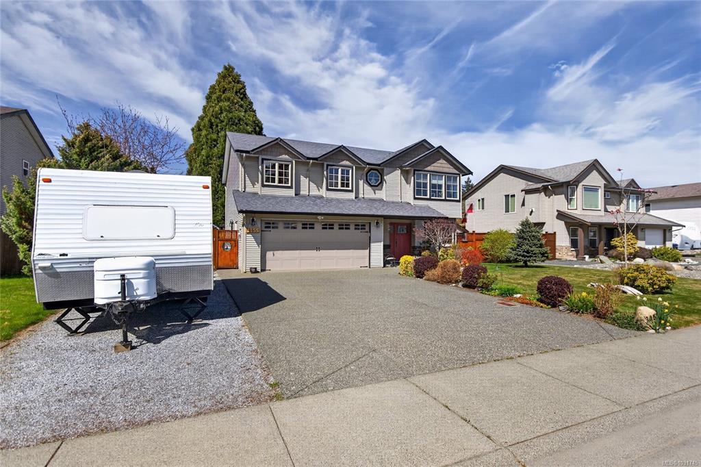 Tucked away on a quiet cul-de-sac in Courtenay City, this well-cared-for 1,894 sq ft split-level home offers comfort & versatility. Built in 2008, it features 4 bedrooms, 3 bathrooms, plus a den/office, ideal for families or working from home. Slate flooring enhances the entry & bathrooms, while the bright living area includes a natural gas fireplace. The lower level offers a rec room with wet bar, bedroom & bathroom offering suite potential. Outside enjoy a private, fully fenced 0.16 acre yard with plenty of sun exposure, mature evergreens, raised garden beds, two sheds, a patio & a deck with mountain views. Double garage providing plenty of storage space plus extra parking area for the RV, boat or other toys. The subdivision has underground services. The home is situated across from a community park with a children's playground. Just steps to a walking trail. Less than a ten minutes walk to amenities including the mall, grocery store, liquor store, restaurants & movie theatre.